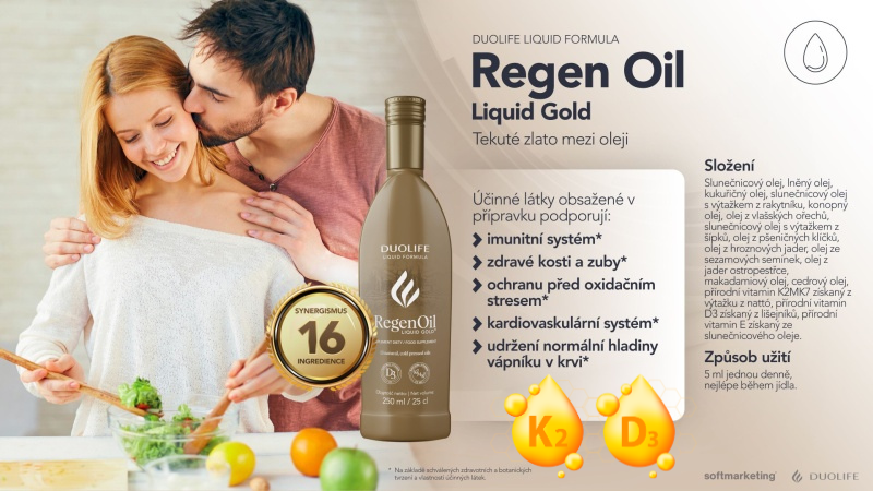 „Stále častěji hledáme přírodní výrobky, které jsou schopné pečovat o náš organismus a podpořit jeho fungování. Pevně věříme síle, kterou nám dává příroda, a chceme výrobky špičkové kvality a přesně takový je DUOLIFE RegenOil Liquid Gold®. Kvalita olejů lisovaných zastudena je nezpochybnitelná. Úloha vitamínu D3 je známa odedávna jako neocenitelné látky pro podporu kosterní soustavy. Nové průzkumy ukazují, že vitamín D3 má také význam pro fungování oběhového systému a podporu činnosti imunitního systému. A kromě toho je zde i vitamín K2 MK7 podporující distribuci vápníku. Právě na bázi těchto cenných složek vznikl DUOLIFE RegenOil Liquid Gold®.
