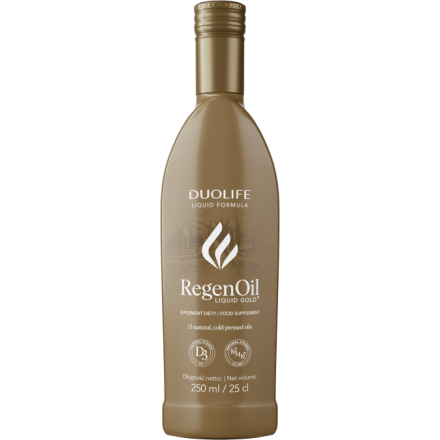 DUOLIFE RegenOil Liquid Gold® je „tekutým zlatem”, které by se bez pochyb mělo objevit v každodenním „menu” všech milovníků zdravého životního stylu. Výrobek se vyznačuje svým jedinečným složením a použitím nerafinovaných rostlinných, a za studena lisovaných olejů, v magickém počtu 13.